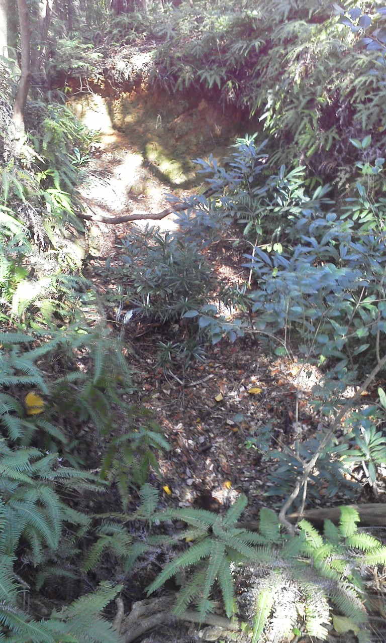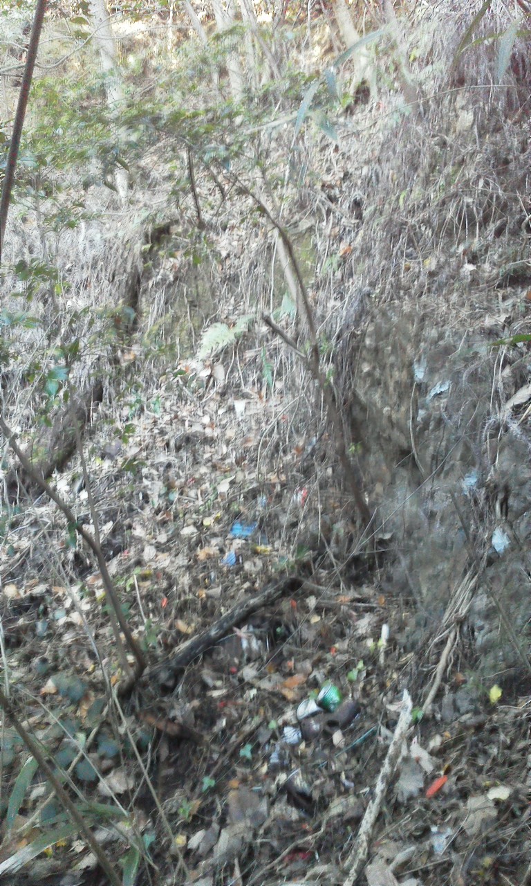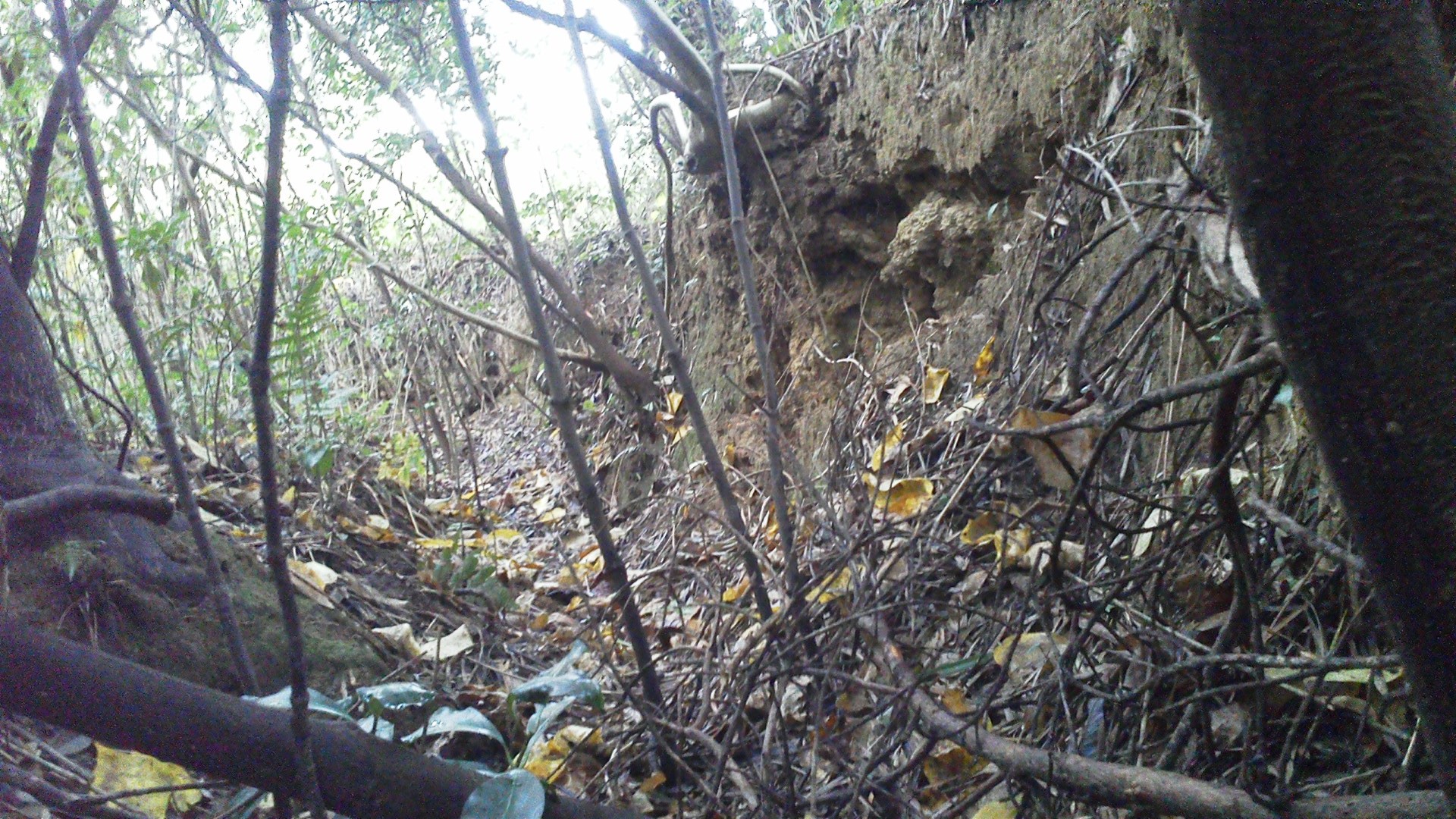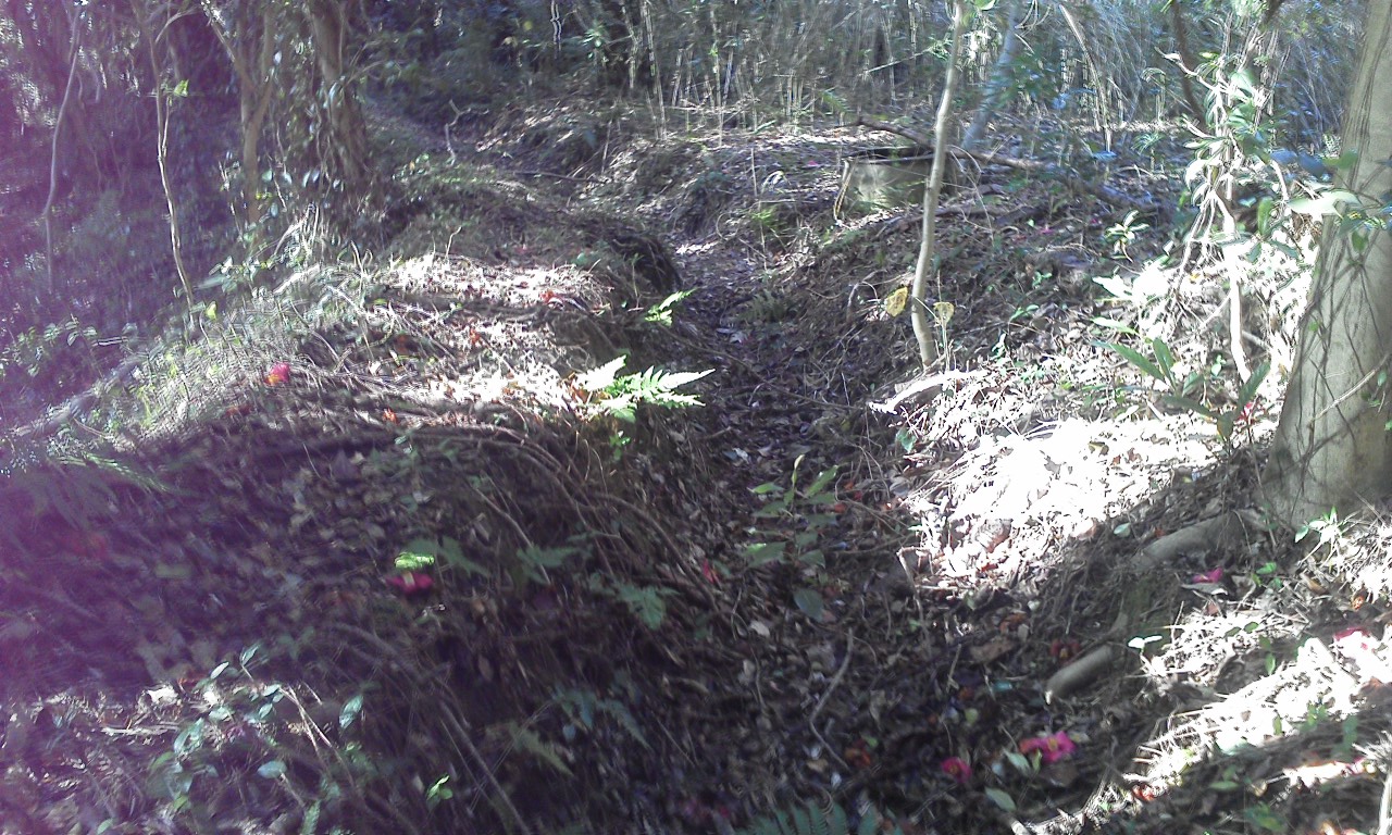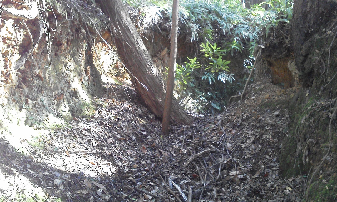 ▼居住壕兼通路。崩落しています。