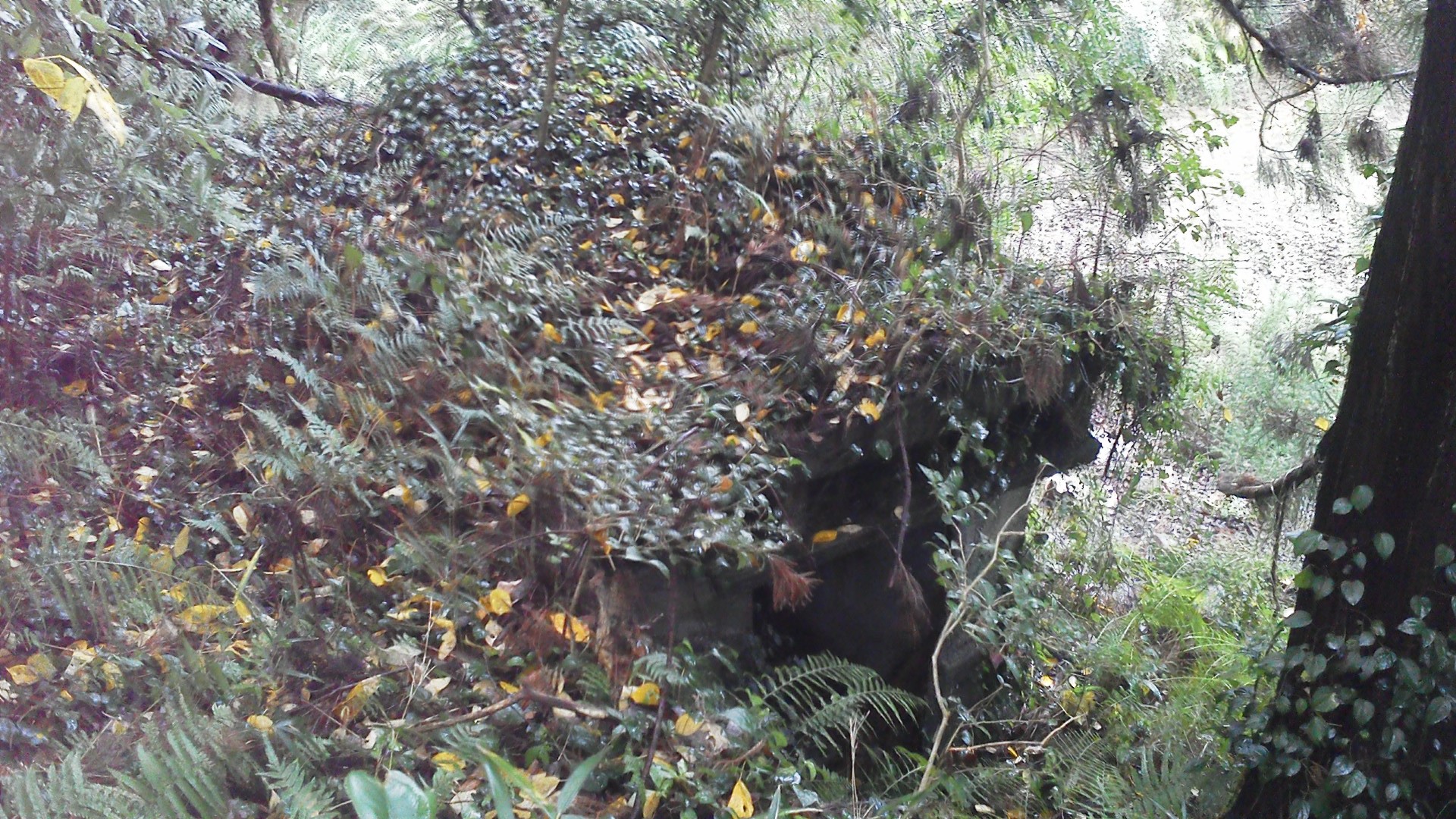 ▼山を貫通していた居住壕です。崩落しています。