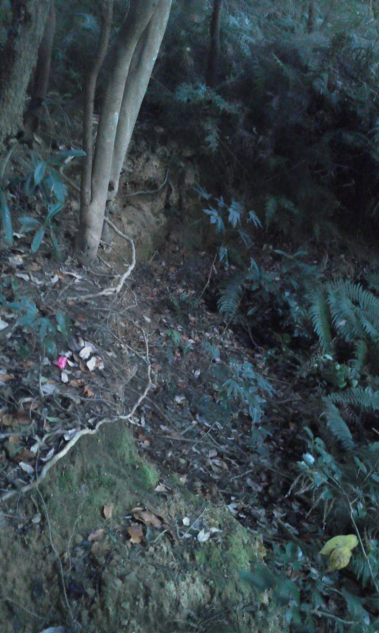 ▼居住壕兼通路。崩落しています。