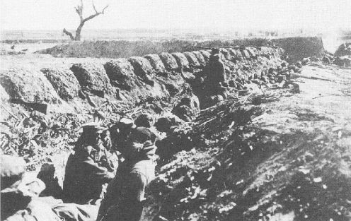 ▽散兵壕で休息する第十師団兵士(明治三十八年三月頃、奉天)