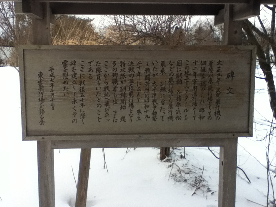 米代川を北に渡った向能代一帯には東雲飛行場(後に陸軍能代飛行場)があり、温存飛行場として東北随一の規模にまで整備拡張され、戦争末期には特攻隊員の訓練が行われました。